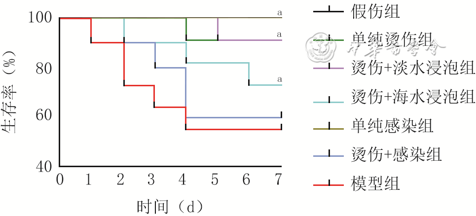 Objective To establish a rat model of sepsis induced by combining seawater immersion with Vibrio vulnificus infection after burns, providing an experimental basis for research on marine burn wound-associated sepsis. Methods This study was conducted using an experimental animal model. A total of 115 eight-week-old male Sprague Dawley rats were randomly allocated using a random number table (grouping method was the same as below) into three groups: burn+seawater immersion+infection group (model group for short, n=45), burn-only group (n=40), and sham injury group (n=30). Rats in the first two groups received standardized dorsal burn injury, followed by either artificial seawater immersion for 30 min+subcutaneous injection of Vibrio vulnificus or injection of an equal volume of normal saline, respectively. In sham injury group, the dorsal region was immersed in warm water to induce sham injury, followed by injection of an equal volume of normal saline. On 1, 3, and 5 days after modeling, hematoxylin-eosin staining was performed to evaluate histopathological changes in the liver, kidney, lung, and heart in the three groups of rats, the pathological damage of the aforementioned organs was evaluated using a semi-quantitative scoring system. According to the instructions of the kit, an enzyme-linked immunosorbent assay reader was used to detect the contents of aspartate aminotransferase (AST), alanine aminotransferase (ALT), blood urea nitrogen, creatinine, creatine kinase isoenzyme (CK-MB), lactate dehydrogenase (LDH), and myeloperoxidase (MPO) in the serum of the three groups of rats, to reflect the degree of liver, kidney and heart injury. Fresh lung tissues in the three groups of rats were weighed and then dried to a constant weight to calculate the lung wet-to-dry weight ratio. In addition, the proportions of helper T cells, B cells, and cytotoxic T cells in peripheral blood of rats in sham and model groups were determined by flow cytometry. Serum levels of inflammatory cytokines in the three groups of rats, including IL-6, IL-10, IL-1β, and TNF-α, were measured using enzyme-linked immunosorbent assay. An additional 70 eight-week-old male Sprague Dawley rats were randomly assigned to seven groups (with each group of 10 rats): sham, burn-only, burn+freshwater immersion, burn+seawater immersion, burn+infection, infection-only, and model groups. The rats in model, burn-only group and sham injury groups were treated as before. The rats in burn+freshwater immersion and burn+seawater immersion groups were first received dorsal burn injury, followed by 30 min immersion in freshwater or artificial seawater, respectively. Rats in infection-only group received subcutaneous injection of the same dose of Vibrio vulnificus at the corresponding dorsal site. Rats in burn+infection group first received dorsal burn injury and then injected with the same dose of Vibrio vulnificus 30 min after injury. Within 7 days after modeling, the survival status of the rats was observed every day and their survival rate was calculated. Results On 1, 3, and 5 days after modeling, the tissue structures of the liver, kidney, lung, and heart of rats in sham injury group were basically normal, and no obvious pathological damage was observed; the tissues of the aforementioned organs of rats in burn-only group had mild to moderate inflammatory reactions, with loose cytoplasm and obvious cellular edema, but the overall structure was basically normal; the tissues of the aforementioned organs of rats in model group showed obvious pathological changes, with the most severe changes on 3 days after modeling, mainly manifested as severe inflammatory reactions, tissue damage, and even necrosis. Compared with that in sham injury group, histopathological injury scores for the liver, kidney, lung, and heart of rats in model group were significantly increased on 1, 3, and 5 day after modeling (P<0.05). Compared with that in burn-only group, histopathological injury scores for the liver, kidney, lung, and heart of rats in model group were significantly increased on 1 day after modeling (P<0.05), and histopathological injury scores for the liver, kidney, and lung were significantly increased on 3 and 5 days after modeling (P<0.05). Compared with that in sham injury group, the serum levels of AST, ALT, blood urea nitrogen, creatinine, CK-MB, LDH, and MPO, as well as the lung wet-to-dry weight ratio of rats in model group were significantly increased on 1 day after modeling (P<0.05), and the serum levels of AST, ALT, blood urea nitrogen, creatinine, LDH, and MPO, as well as the lung wet-to-dry weight ratio were significantly increased on 3 and 5 days after modeling (P<0.05). Compared with that in burn-only group, the serum levels of AST, ALT, blood urea nitrogen, creatinine, CK-MB, LDH, and MPO, as well as the lung wet-to-dry weight ratio of rats in model group were significantly increased on 1 day after modeling (P<0.05), the serum levels of AST, ALT, creatinine, and LDH were significantly increased on 3 days after modeling (P<0.05),and the serum levels of AST, ALT, creatinine, LDH, and MPO on 5 days after modeling (P<0.05). On 1, 3, and 5 days after modeling, compared with that in sham injury group, the proportions of helper T cells, B cells, and cytotoxic T cells in peripheral blood of rats in model group were significantly increased (P<0.05). On 1, 3, and 5 days after modeling, the serum levels of IL-6, IL-10, IL-1β, and TNF-α of rats in model group were significantly higher than those in both sham injury and burn-only groups (P values all <0.05). on 7 days after modeling, the survival rate of rats in model group was only 50%, whereas it was 100% in both sham injury and infection-only groups. Within 7 days after modeling, the survival rate of rats in model group was significantly lower than that in sham, burn-only, burn+freshwater immersion, burn+seawater immersion, and infection-only groups (with χ2 values of 19.31, 12.11, 12.33, 9.